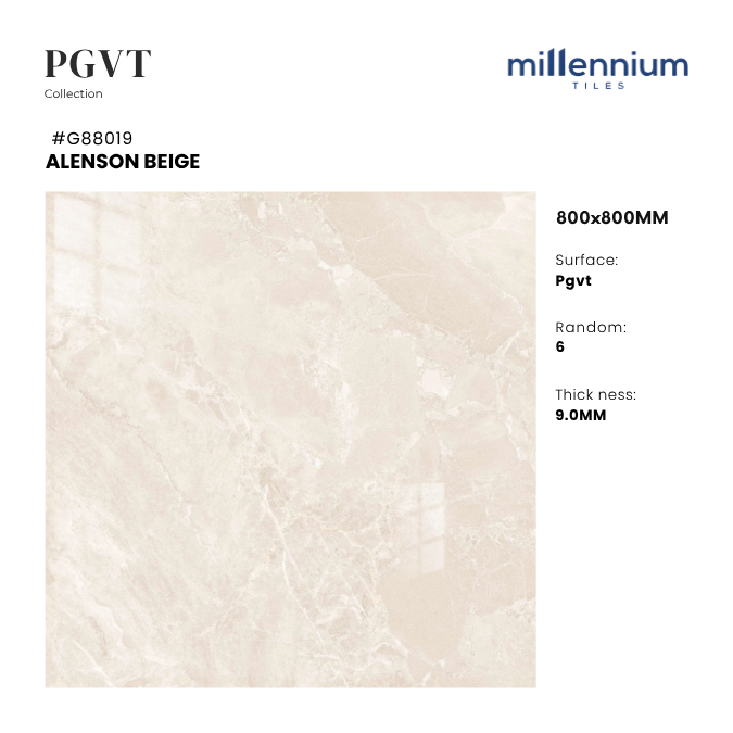 ALENSON BEIGE – G88019 là sự lựa chọn hoàn hảo cho những công trình đề cao sự sang trọng, tinh tế và đẳng cấp. Với chất lượng quốc tế, thiết kế hiện đại và công nghệ PGVT tiên tiến, sản phẩm khẳng định vị thế thương hiệu Millennium Tiles trong phân khúc gạch cao cấp tại Việt Nam.