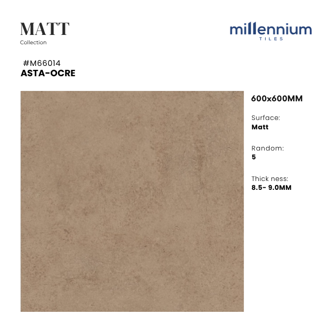 ASTA OCRE – M66014 là mẫu gạch Matt (mờ, chống trơn) cao cấp, kích thước 600x600mm, nổi bật với gam ocre (nâu vàng đất) kết hợp vân đá marble sống động. Sản phẩm mang lại không gian vẻ đẹp ấm áp – hiện đại – an toàn, phù hợp nhiều công trình dân dụng và thương mại.