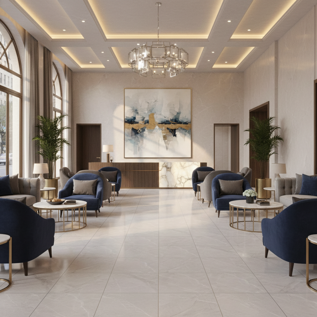 Với gam trắng marble thanh thoát và bề mặt bóng kính sang trọng, PONCA BIANCO phù hợp với nhiều công trình cao cấp: