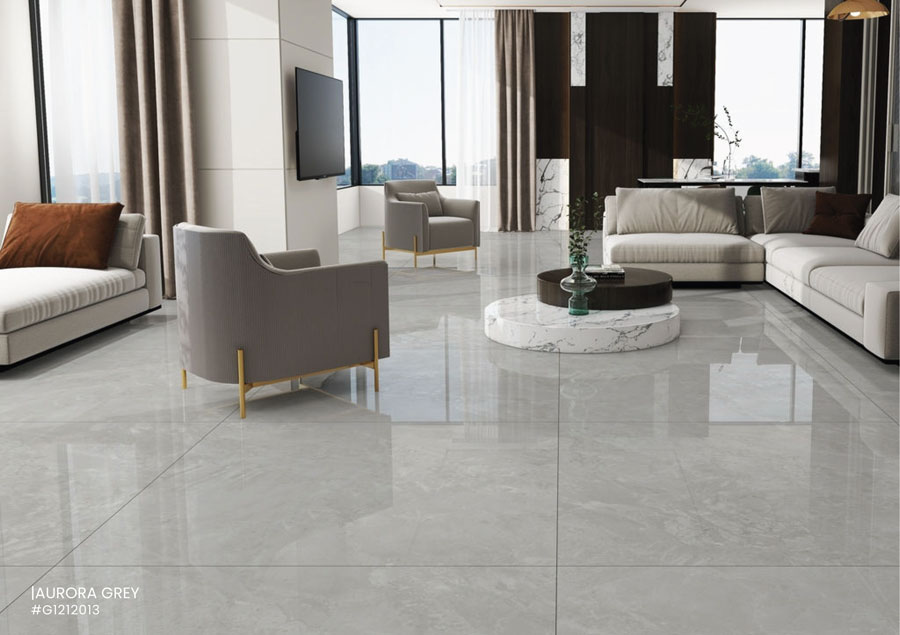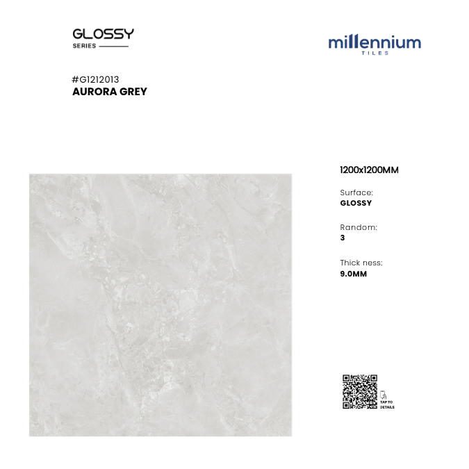 AURORA GREY – G1212013 thuộc bộ sưu tập 1200x1200mm Glossy PGVT cao cấp của Millennium Tiles. Đây là mẫu gạch khổ lớn với gam xám thanh lịch, bề mặt bóng kính sang trọng, kết hợp vân đá marble nhẹ nhàng, mang lại không gian hiện đại – tinh tế – đẳng cấp.