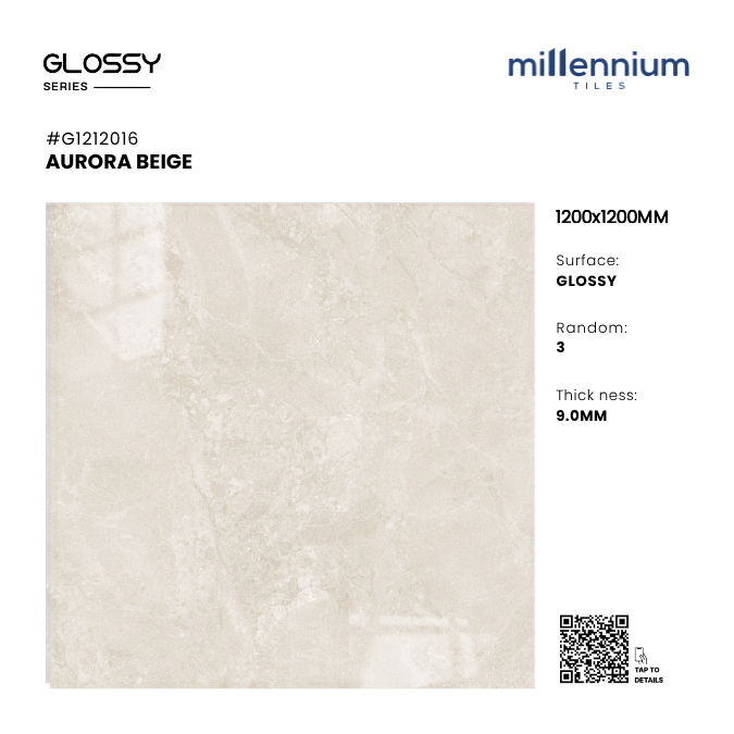 AURORA BEIGE – G1212016 thuộc bộ sưu tập 1200x1200mm Glossy PGVT cao cấp của Millennium Tiles. Đây là mẫu gạch khổ lớn mang gam beige sáng sang trọng, bề mặt bóng kính kết hợp vân đá marble tự nhiên tinh tế, mang đến không gian ấm áp – thanh lịch – hiện đại.