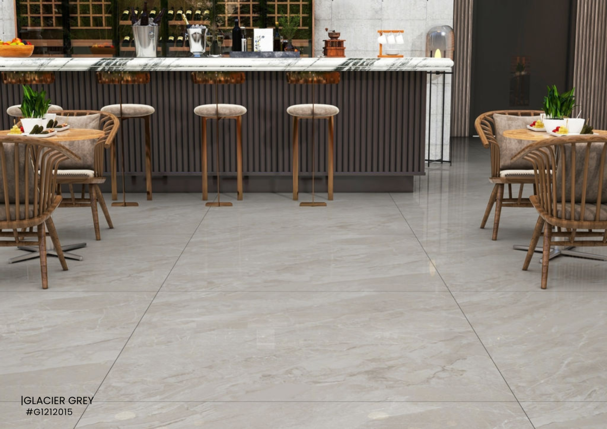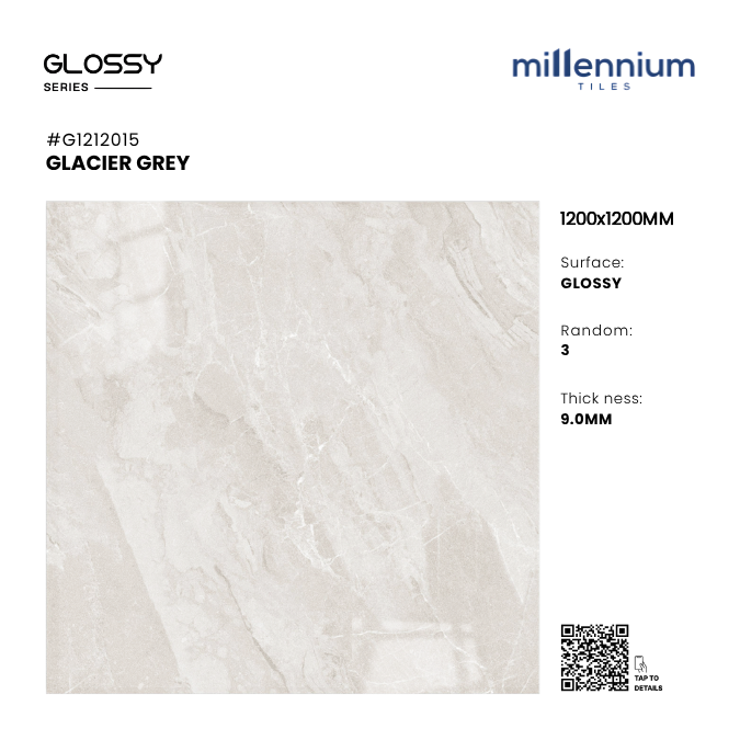GLACIER GREY – G1212015 thuộc bộ sưu tập 1200x1200mm Glossy PGVT cao cấp của Millennium Tiles. Đây là mẫu gạch khổ lớn với gam xám lạnh hiện đại, gợi cảm hứng từ sắc băng tuyết thiên nhiên, bề mặt bóng kính kết hợp vân marble tinh tế, mang đến không gian sang trọng – thanh lịch – thời thượng.