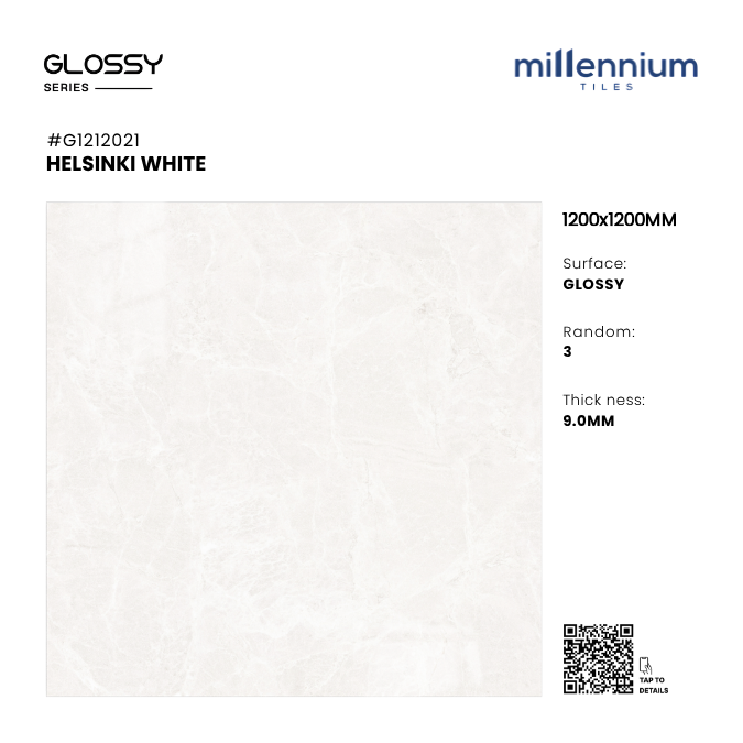 HELSINKI WHITE – G1212021 thuộc bộ sưu tập 1200x1200mm Glossy PGVT cao cấp của Millennium Tiles. Đây là mẫu gạch khổ lớn mang gam trắng sáng tinh khiết, lấy cảm hứng từ phong cách Bắc Âu (Scandinavian), kết hợp bề mặt bóng kính sang trọng cùng vân marble nhẹ nhàng, giúp không gian trở nên thoáng rộng – hiện đại – thanh lịch.