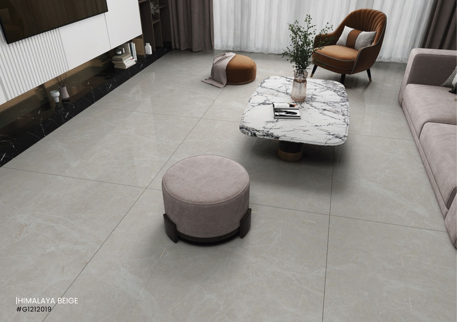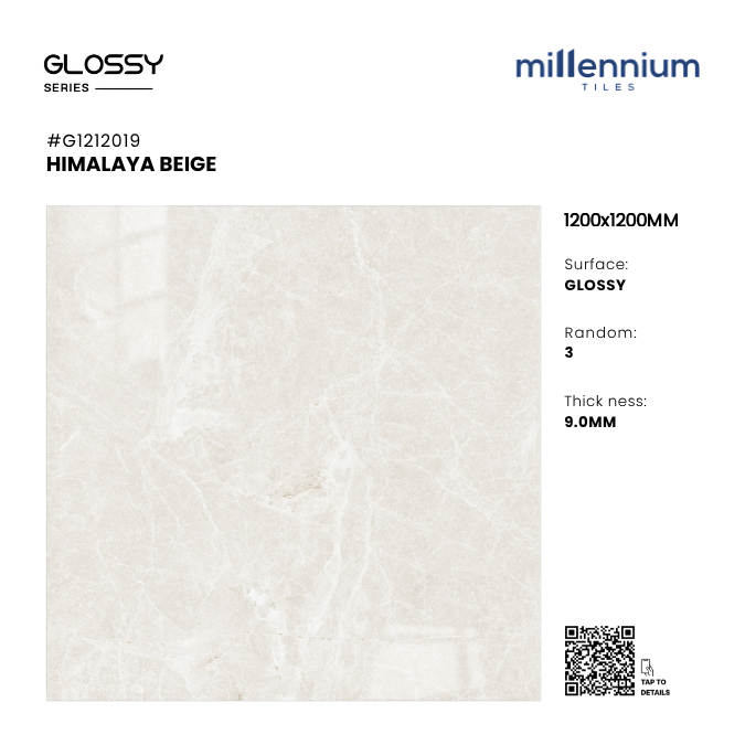 HIMALAYA BEIGE – G1212019 thuộc bộ sưu tập 1200x1200mm Glossy PGVT cao cấp của Millennium Tiles. Mẫu gạch khổ lớn này mang gam beige ấm áp, gợi cảm hứng từ dãy núi Himalaya hùng vĩ, kết hợp vân đá marble tự nhiên mềm mại và bề mặt bóng kính cao cấp, tạo nên không gian sang trọng – thanh lịch – ấm cúng.