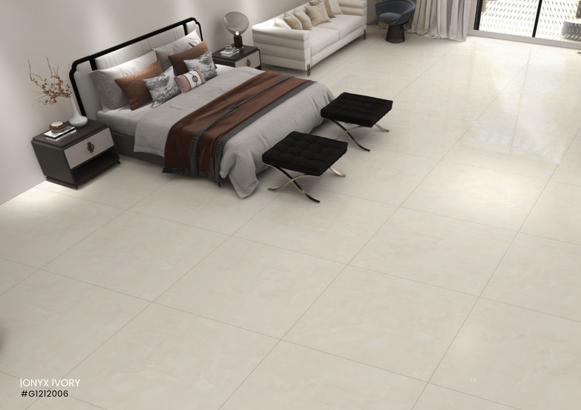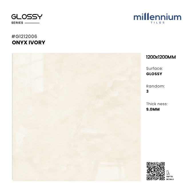 ONYX IVORY – G1212006 thuộc bộ sưu tập 1200x1200mm Glossy PGVT cao cấp của Millennium Tiles. Đây là mẫu gạch khổ lớn với gam ivory ngà sáng, lấy cảm hứng từ vẻ đẹp trong suốt của đá onyx, kết hợp bề mặt bóng kính cao cấp, tạo hiệu ứng sang trọng – tinh tế – đẳng cấp quốc tế.