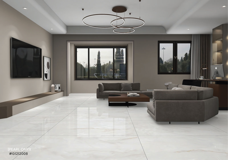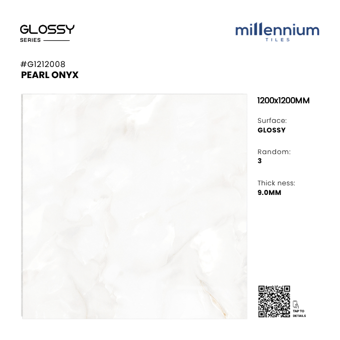 PEARL ONYX – G1212008 thuộc bộ sưu tập 1200x1200mm Glossy PGVT cao cấp của Millennium Tiles. Đây là mẫu gạch khổ lớn mang gam trắng ngọc trai sang trọng, kết hợp vân đá onyx mềm mại, bề mặt bóng kính cao cấp, tạo nên không gian tinh tế – thanh lịch – đẳng cấp.