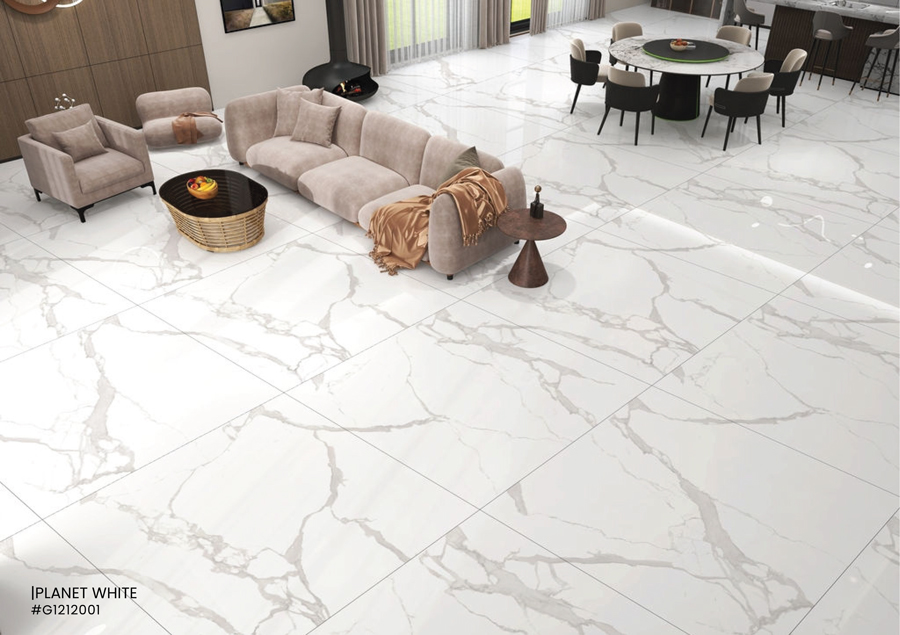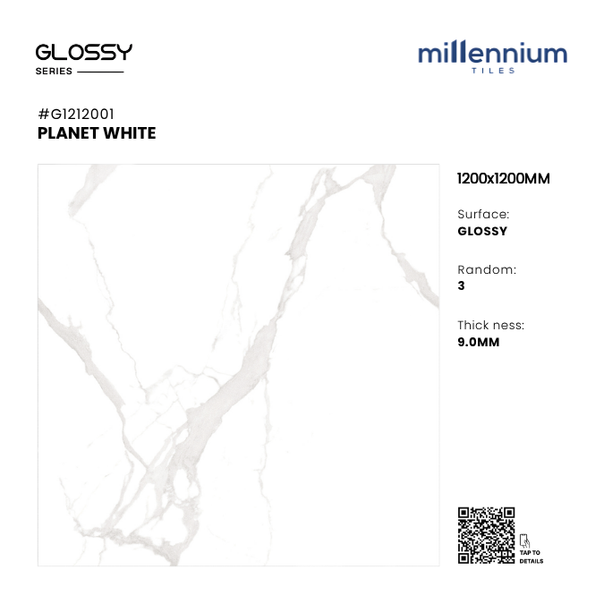 PLANET WHITE – G1212001 thuộc bộ sưu tập 1200x1200mm Glossy PGVT cao cấp của Millennium Tiles. Đây là mẫu gạch khổ lớn với gam trắng sáng tinh khiết, kết hợp vân marble mềm mại trên nền bóng kính cao cấp, mang lại không gian sang trọng – thoáng rộng – tinh tế.