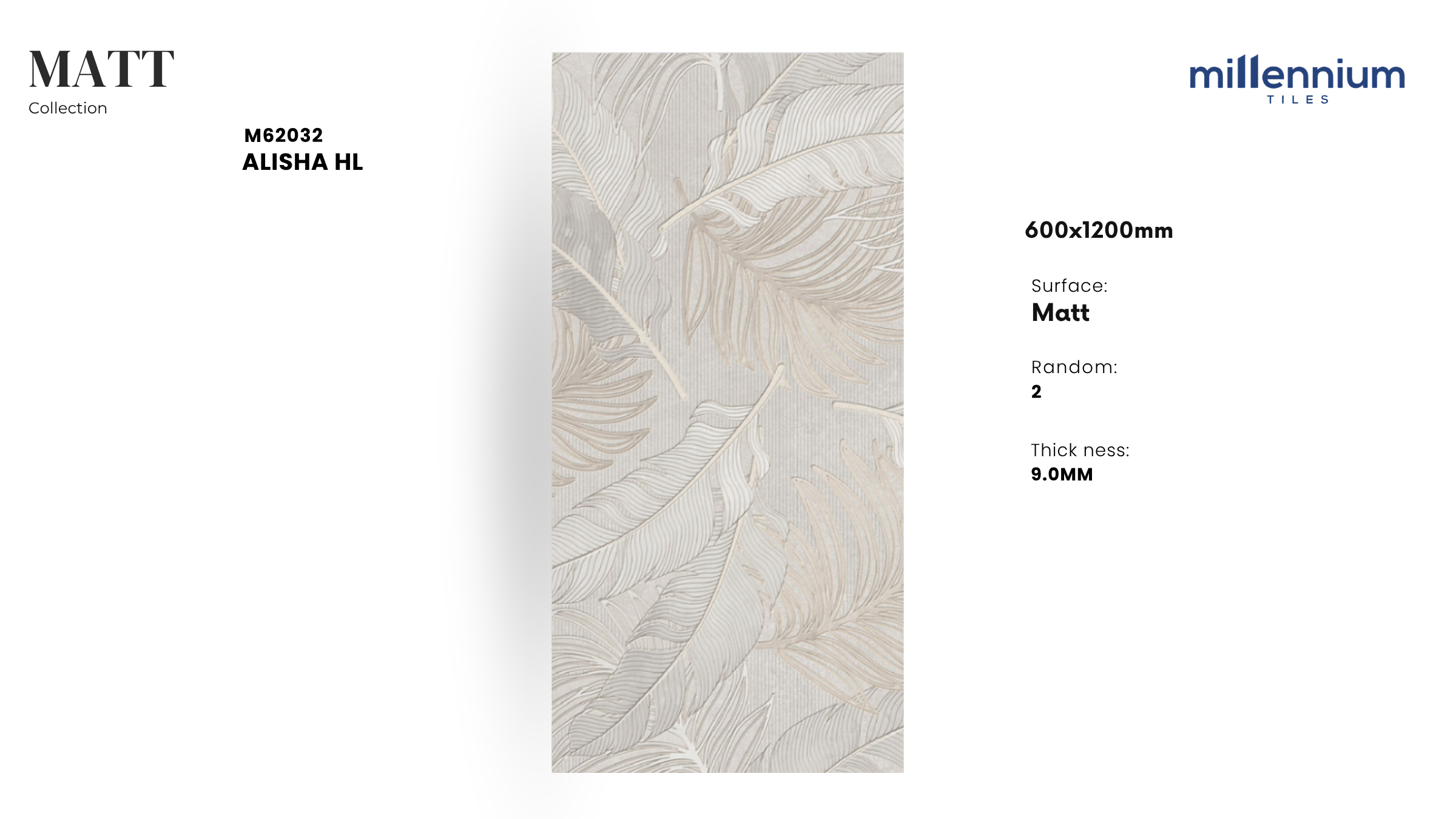 ALISHA HL – M62032 là mẫu gạch trang trí (HL – Highlight) thuộc dòng Matt (mờ, chống trơn), kích thước 600x1200mm. Thiết kế độc đáo với họa tiết hoa văn trang trí tinh tế trên nền màu sáng hiện đại, mang lại sự sang trọng – nghệ thuật – khác biệt cho không gian.