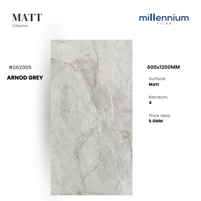 ARNOD GREY – S62005 là mẫu gạch Matt (mờ, chống trơn) cao cấp, kích thước 600x1200mm, với gam xám marble hiện đại kết hợp vân đá tự nhiên tinh tế. Bề mặt mờ mang lại cảm giác thanh lịch – chắc chắn – an toàn, thích hợp cho nhiều loại công trình dân dụng và thương mại.