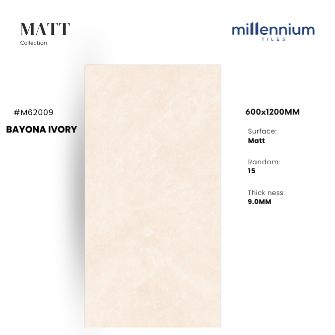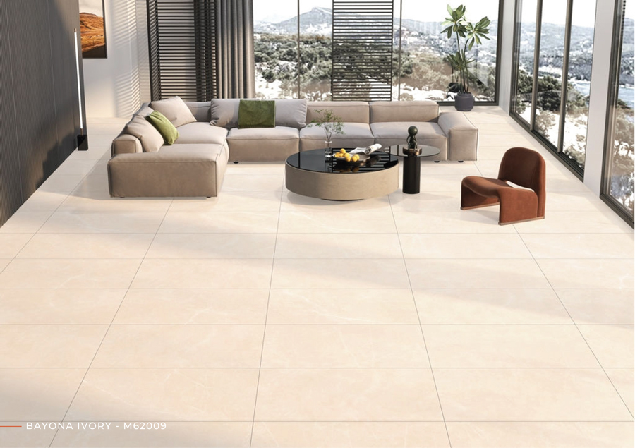BAYONA IVORY – M62009 không chỉ là gạch lát/ốp, mà còn là giải pháp hoàn thiện không gian hiện đại & tinh tế. Với gam ivory kem ngà thanh lịch, vân đá marble nhẹ nhàng, bề mặt Matt chống trơn và độ bền cao, sản phẩm mang đến sự cân bằng giữa thẩm mỹ – công năng – an toàn, lý tưởng cho công trình dân dụng và thương mại cao cấp.