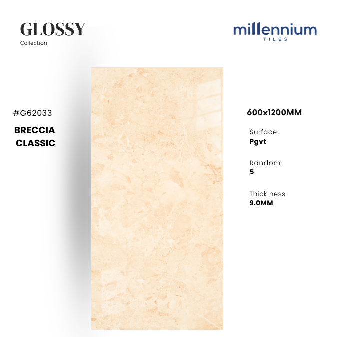 BRECCIA CLASSIC – G62033 thuộc bộ sưu tập Glossy PGVT cao cấp của Millennium Tiles, kích thước 600x1200mm. Gạch nổi bật với gam kem vàng ấm áp kết hợp họa tiết đá Breccia tự nhiên đặc trưng, tạo hiệu ứng bề mặt sống động và tinh tế. Bề mặt bóng kính giúp tăng độ phản chiếu ánh sáng, mang lại cảm giác sang trọng và mở rộng không gian.