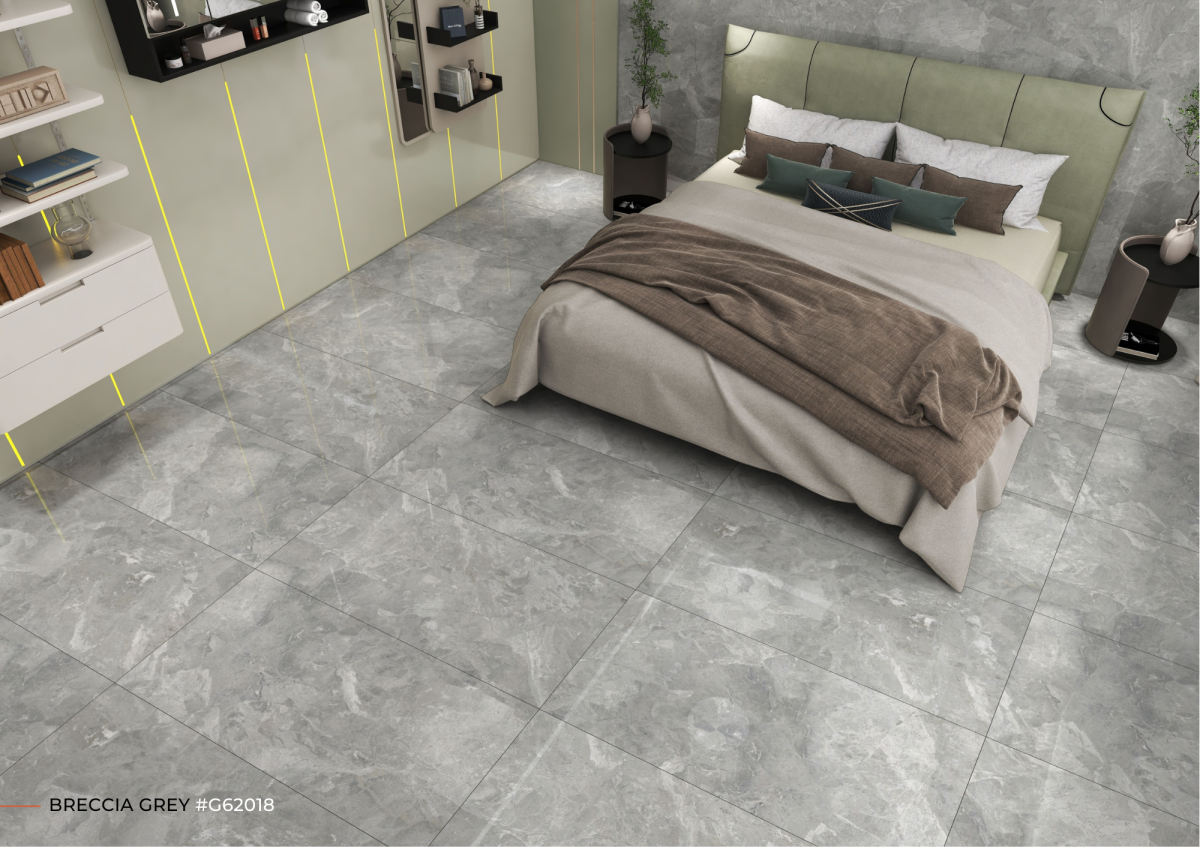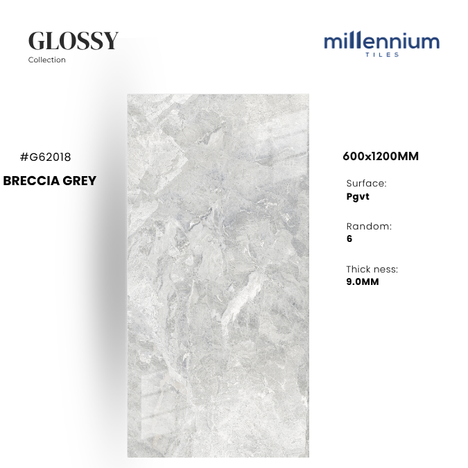 BRECCIA GREY – G62018 thuộc bộ sưu tập Glossy PGVT cao cấp của Millennium Tiles, kích thước 600x1200mm. Gạch nổi bật với gam xám trung tính kết hợp họa tiết đá Breccia tự nhiên đặc trưng, tạo hiệu ứng bề mặt độc đáo, mạnh mẽ nhưng vẫn tinh tế. Bề mặt bóng kính giúp tăng khả năng phản chiếu ánh sáng, mang lại chiều sâu và vẻ đẹp hiện đại cho không gian.