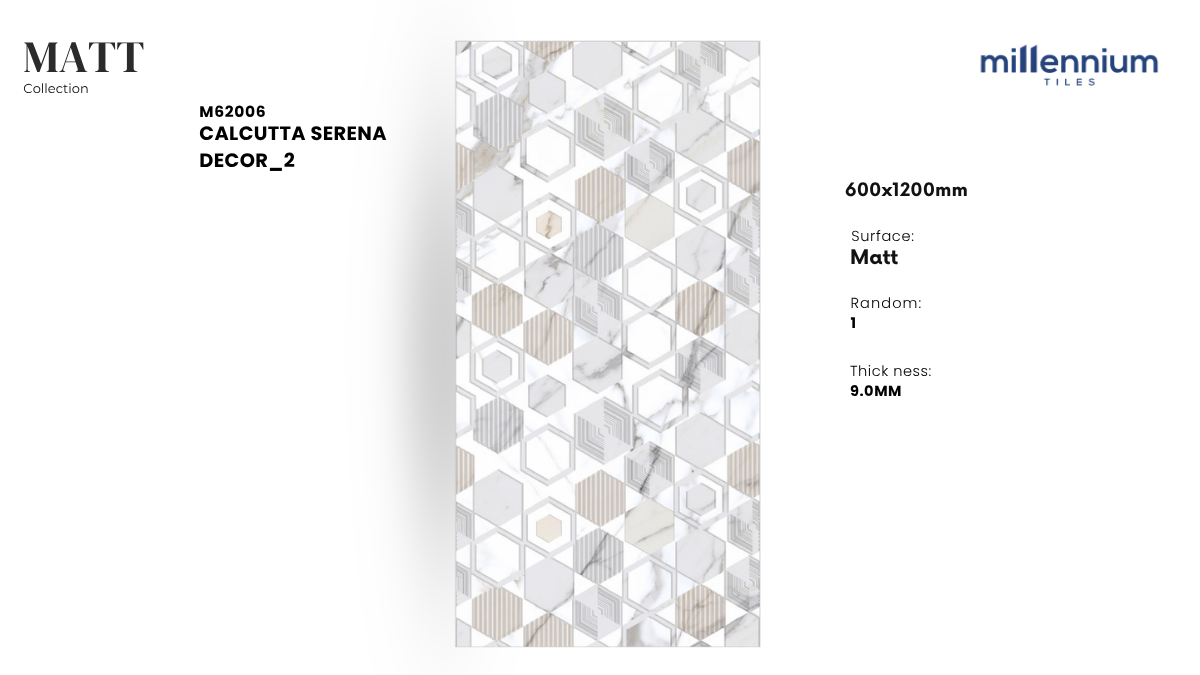 CALCUTTA SERENA DECOR_2 – M62046 là mẫu gạch trang trí (Decor) thuộc dòng Matt (mờ, chống trơn), kích thước 600x1200mm. Thiết kế mang cảm hứng từ đá Calacatta sang trọng, kết hợp họa tiết trang trí nghệ thuật tinh tế, mang lại vẻ đẹp đẳng cấp – sáng tạo – hiện đại cho không gian.