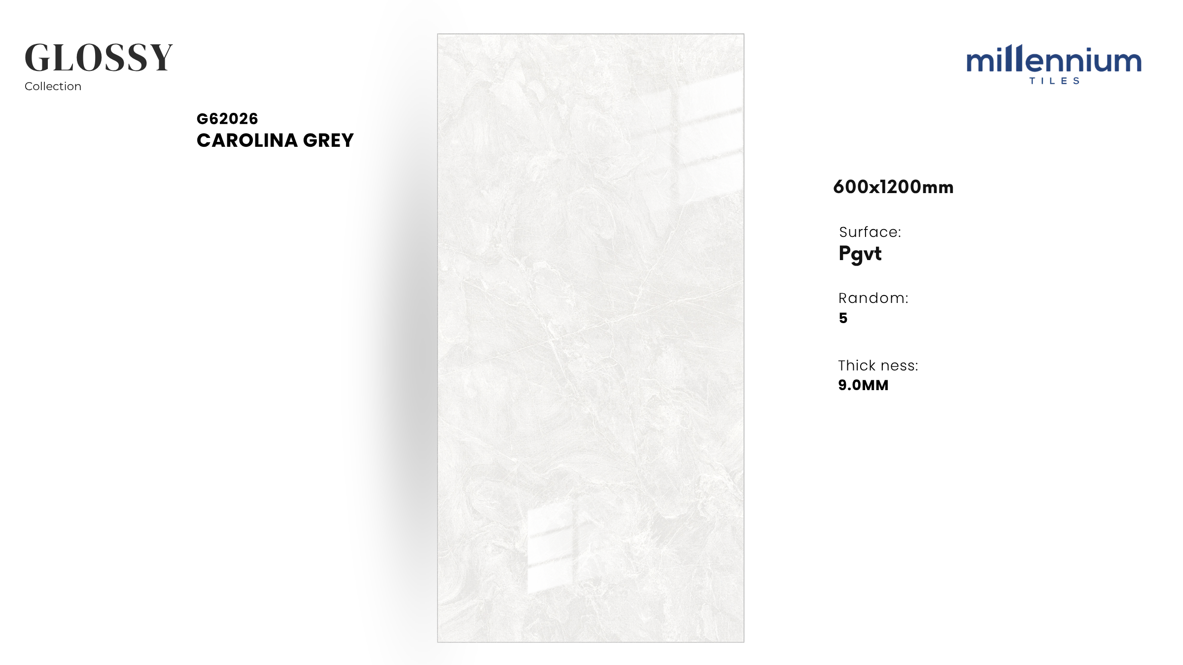 CAROLINA GREY – G62026 thuộc bộ sưu tập Glossy PGVT cao cấp của Millennium Tiles, kích thước 600x1200mm. Sản phẩm sở hữu gam xám trung tính hiện đại, bề mặt bóng kính sang trọng, kết hợp vân marble nhẹ nhàng, mang lại không gian thanh lịch, tinh tế và rộng thoáng.