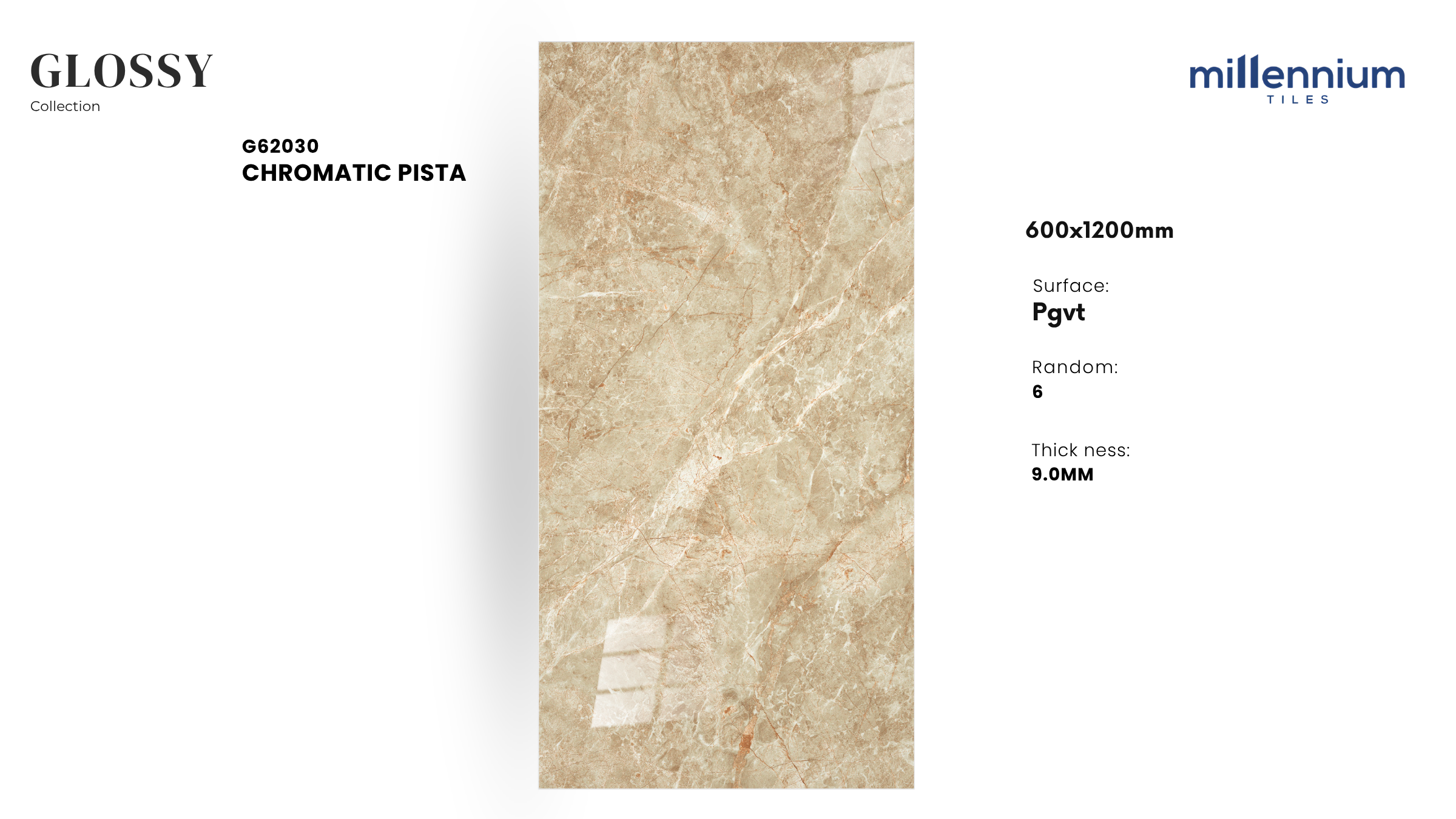 CROMATIC PISTA – G62030 thuộc bộ sưu tập Glossy PGVT cao cấp của Millennium Tiles, kích thước 600x1200mm. Mẫu gạch mang gam xám pista (hơi ánh xanh nhạt) kết hợp vân đá marble tinh tế, bề mặt bóng kính sang trọng giúp mở rộng không gian và tăng độ phản chiếu ánh sáng.