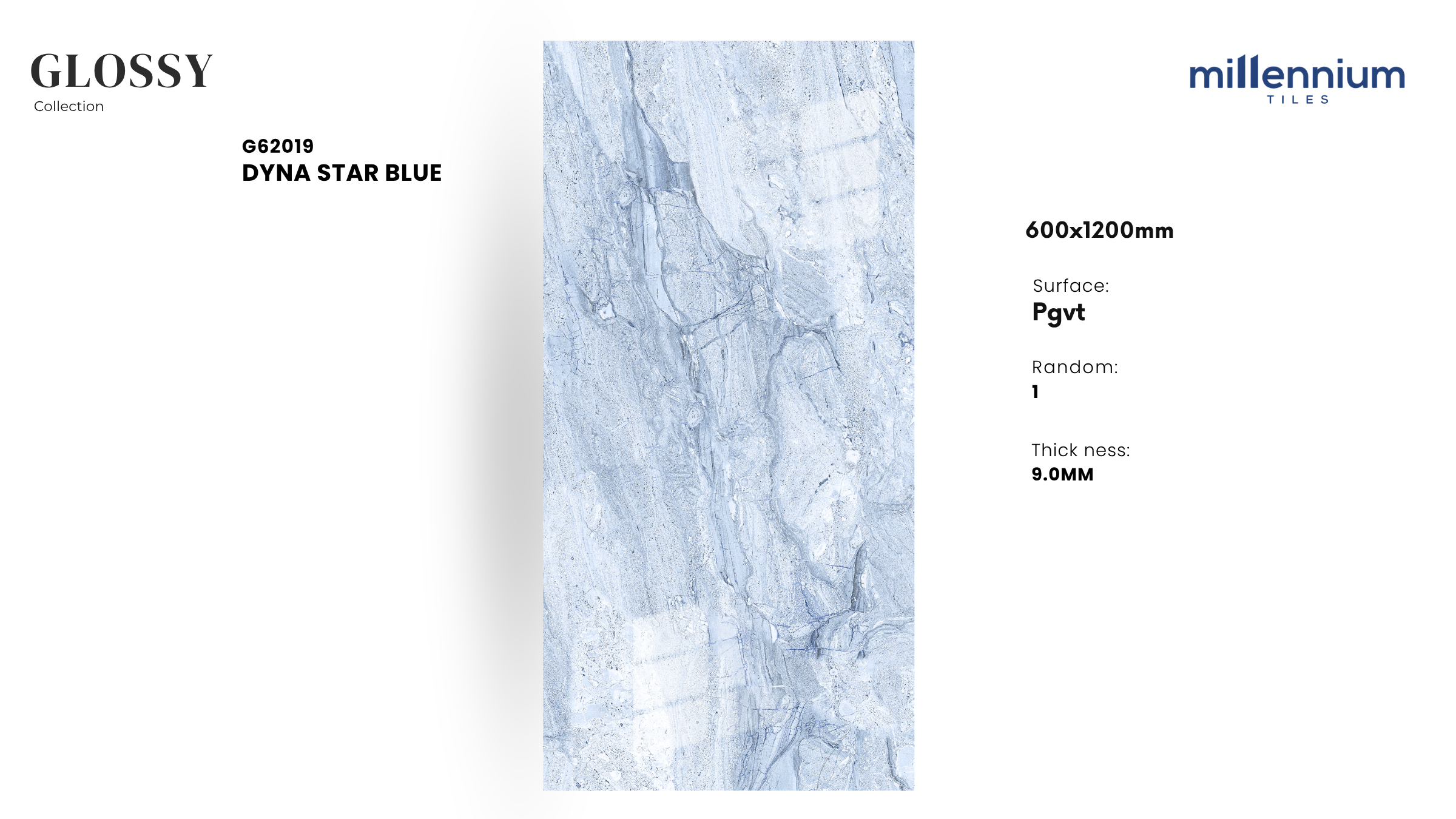 DYNA STAR BLUE – G62019 thuộc bộ sưu tập Glossy PGVT cao cấp của Millennium Tiles, kích thước 600x1200mm. Đây là mẫu gạch độc đáo với gam xanh lam ấn tượng, vân đá marble mạnh mẽ và bề mặt bóng kính sang trọng, tạo hiệu ứng thị giác nổi bật, phù hợp cho những không gian cần sự khác biệt – sáng tạo – đẳng cấp.