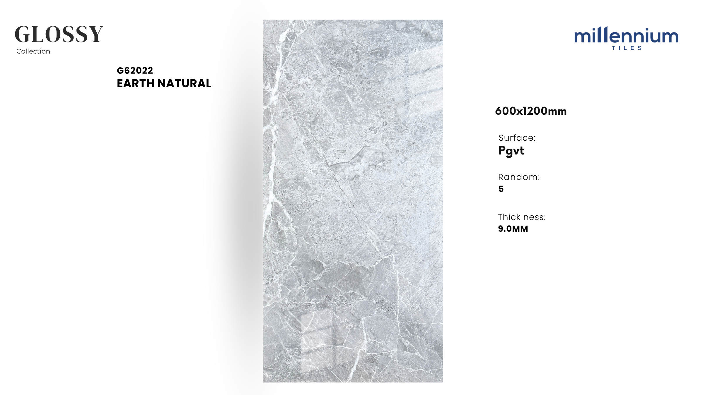 EARTH NATURAL – G62022 thuộc bộ sưu tập Glossy PGVT cao cấp của Millennium Tiles, kích thước 600x1200mm. Đây là mẫu gạch mang gam be – nâu đất tự nhiên, kết hợp vân đá marble tinh tế, bề mặt bóng kính sang trọng, tạo nên không gian ấm áp – gần gũi – hiện đại.