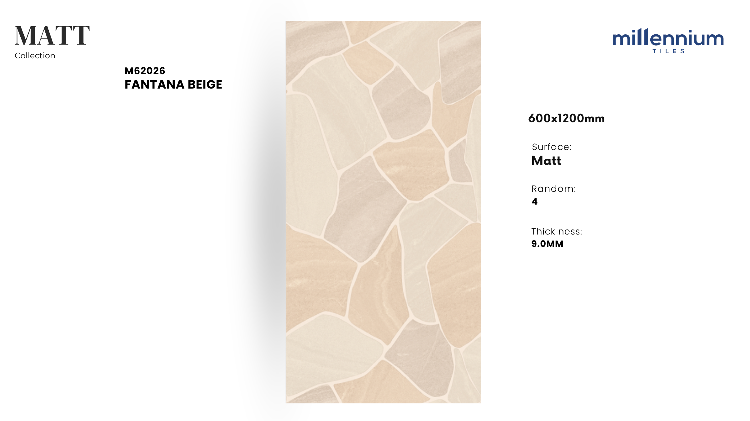 FANTANA BEIGE – M62026 không chỉ là gạch lát/ốp, mà còn là giải pháp hoàn thiện không gian tinh tế & hiện đại. Với gam beige nhẹ nhàng, vân đá marble thanh lịch, bề mặt Matt chống trơn và độ bền vượt trội, sản phẩm mang lại sự cân bằng giữa thẩm mỹ – công năng – an toàn, lý tưởng cho công trình dân dụng và thương mại cao cấp.