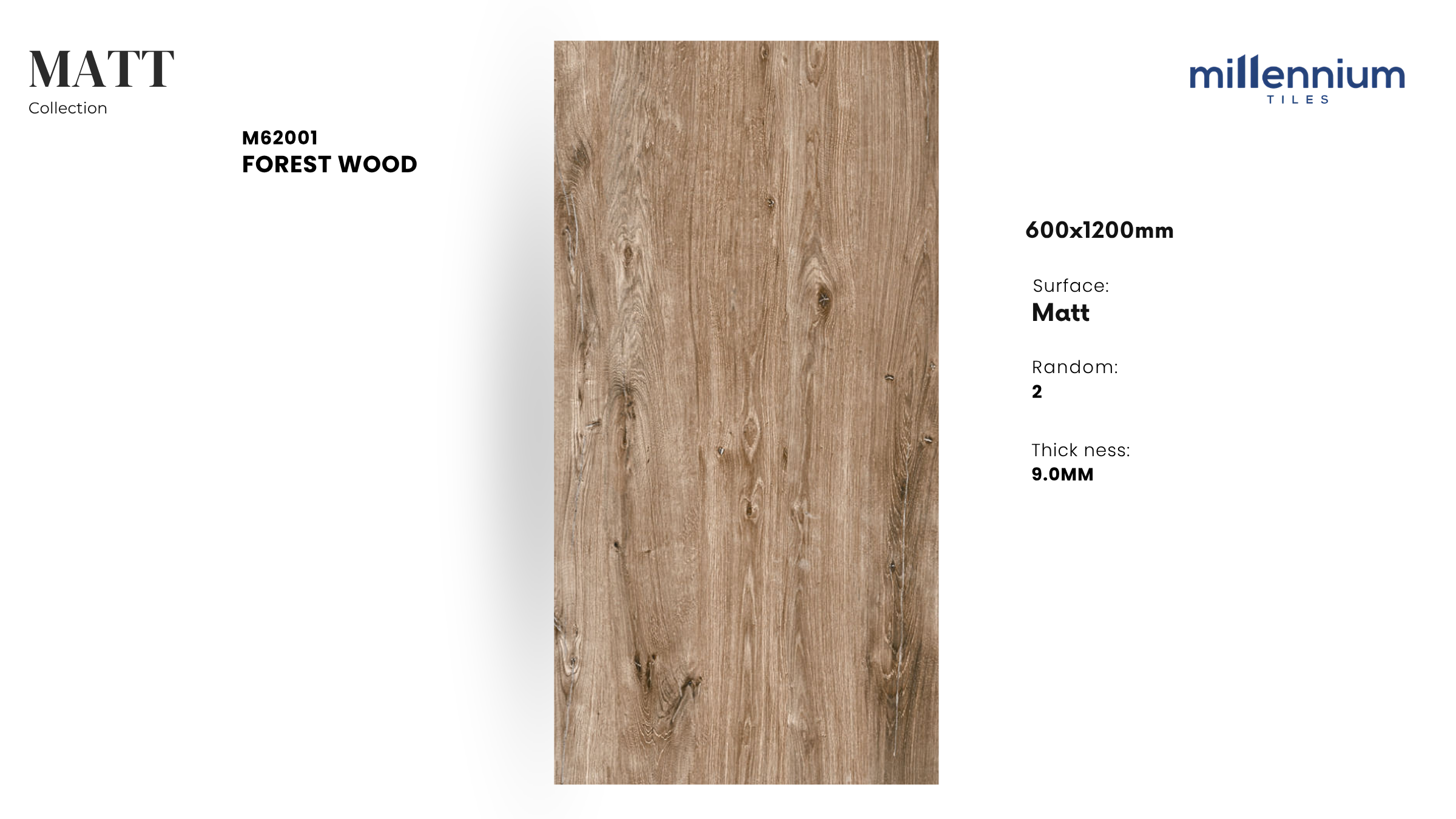 FOREST WOOD – M62001 là mẫu gạch giả gỗ thuộc dòng Matt (mờ, chống trơn), kích thước 600x1200mm, nổi bật với gam nâu gỗ rừng tự nhiên và hiệu ứng vân gỗ sống động. Bề mặt mờ mang lại cảm giác ấm áp – mộc mạc – an toàn, vừa giữ được nét đẹp của gỗ tự nhiên vừa đảm bảo độ bền vượt trội của gạch porcelain.