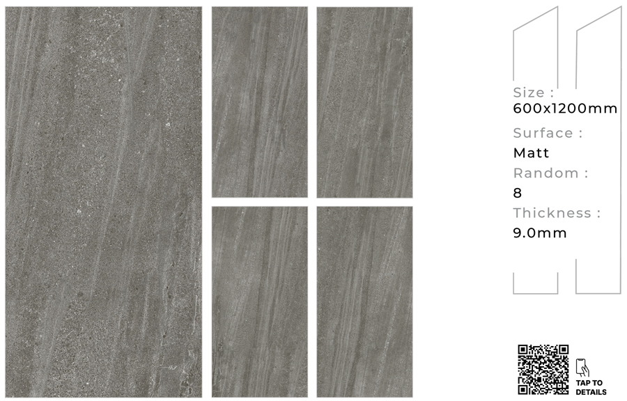 NEXUS GRIS – M62017 là mẫu gạch Matt (mờ, chống trơn) cao cấp, kích thước 600x1200mm, nổi bật với gam xám ghi hiện đại và vân đá marble tự nhiên. Thiết kế mang lại sự thanh lịch – tinh tế – bền vững, dễ dàng kết hợp với nhiều phong cách nội thất.