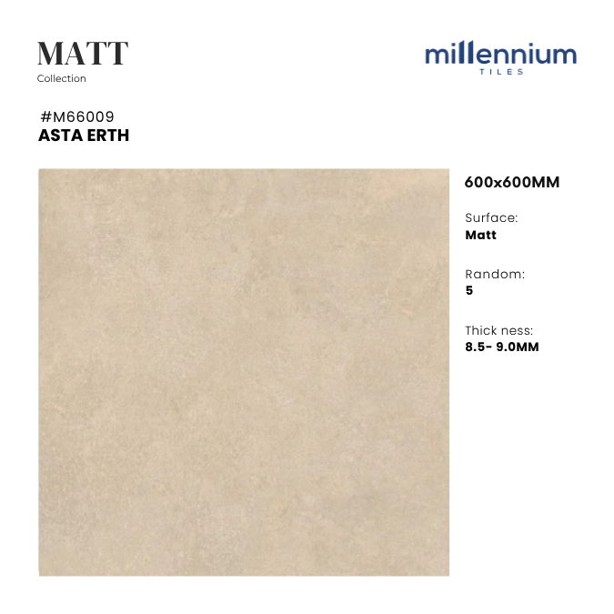 ASTA ERTH – M66009 là mẫu gạch Matt (mờ, chống trơn) cao cấp, kích thước 600x600mm, mang gam nâu đất tự nhiên kết hợp vân đá marble sống động. Sản phẩm mang đến cảm giác ấm áp – gần gũi – bền bỉ, vừa thẩm mỹ vừa an toàn trong sử dụng.