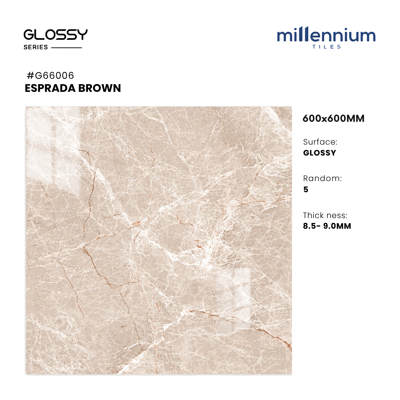 ESPRADA BROWN – G66006 là mẫu gạch PGVT bóng kính cao cấp, kích thước 600x600mm, mang gam nâu marble trầm ấm kết hợp vân đá tự nhiên độc đáo. Bề mặt bóng kính phản chiếu ánh sáng, tạo hiệu ứng sang trọng – đẳng cấp – hiện đại, lý tưởng cho các công trình cao cấp.
