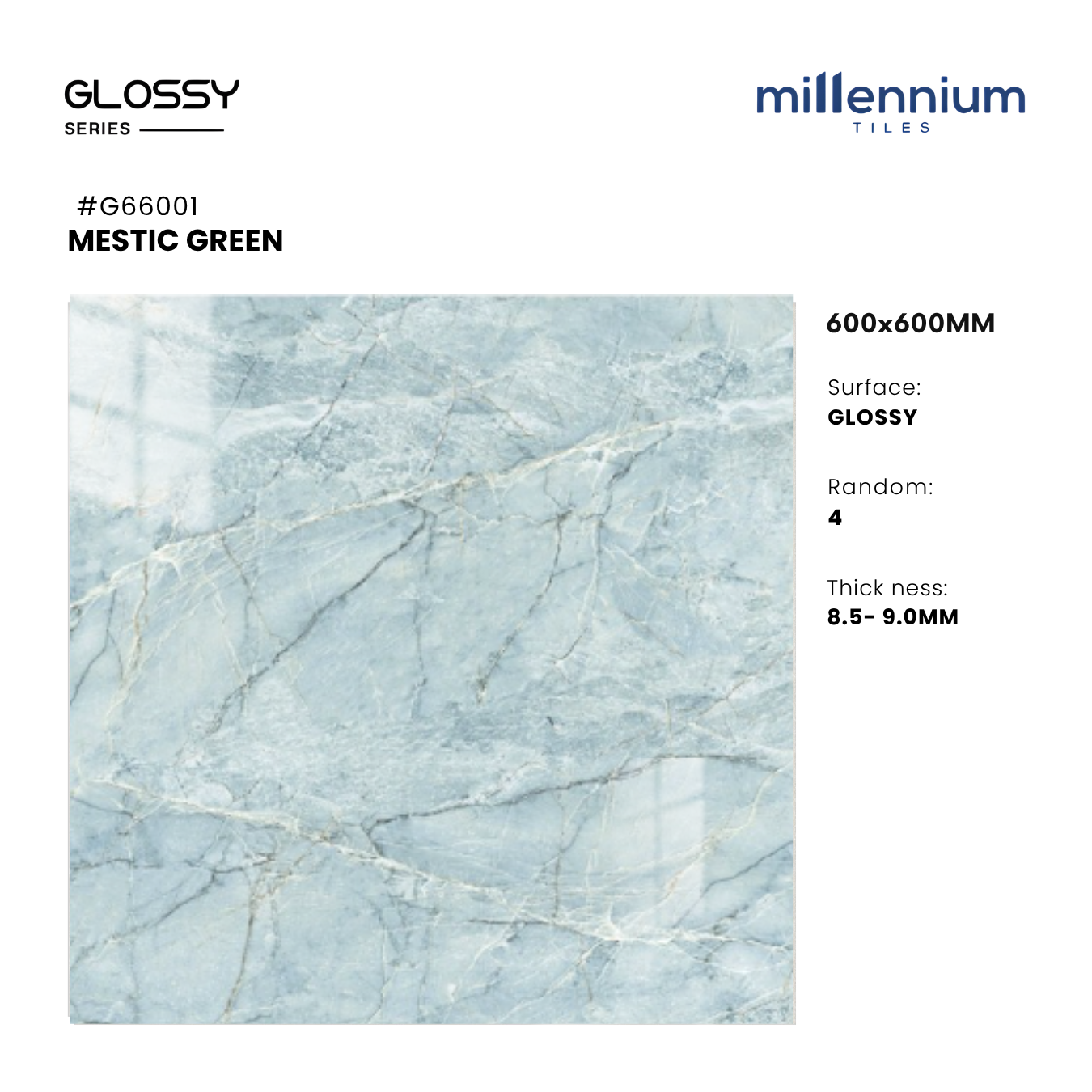 MESTIC GREEN – G66006 là mẫu gạch PGVT bóng kính cao cấp, kích thước 600x600mm, mang gam xanh marble thanh lịch kết hợp vân đá tự nhiên mềm mại, tinh tế. Sắc xanh nhẹ pha xám tạo cảm giác mát mẻ – hiện đại – thư giãn, phù hợp với xu hướng thiết kế không gian mở và gần gũi thiên nhiên.