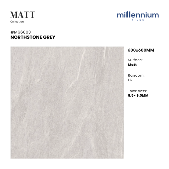 NORTHSTONE GREY – M66003 là mẫu gạch Matt (mờ, chống trơn) cao cấp, kích thước 600x600mm, mang gam xám đá tự nhiên với vân stone mạnh mẽ, khỏe khoắn. Sản phẩm mang lại vẻ đẹp hiện đại – bền vững – an toàn, thích hợp cho cả công trình dân dụng và thương mại.