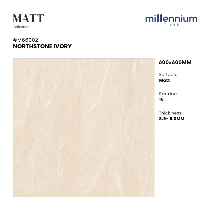NORTHSTONE IVORY – M66002 là mẫu gạch Matt (mờ, chống trơn) cao cấp, kích thước 600x600mm, nổi bật với gam ivory (kem ngà) kết hợp vân đá stone tự nhiên nhẹ nhàng. Bề mặt mờ giúp không gian vừa mang tính ấm áp – an toàn – tinh tế, đồng thời tăng độ bền cho công trình.