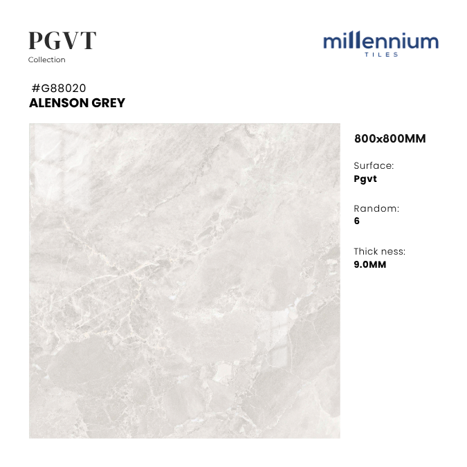ALENSON GREY – G88020 thuộc dòng gạch PGVT (Polished Glazed Vitrified Tile) cao cấp của Millennium Tiles, mang đến sự tinh tế và hiện đại với gam màu xám trung tính. Bề mặt bóng kính sang trọng kết hợp vân đá marble tự nhiên giúp không gian thêm chiều sâu và phản chiếu ánh sáng một cách tinh xảo. Kích thước 800x800mm cùng độ dày 9.0mm tạo sự cân đối cho nhiều loại công trình. Với 6 mẫu vân random, sản phẩm hạn chế lặp lại, đem đến sự đồng đều và tự nhiên cho sàn nhà.