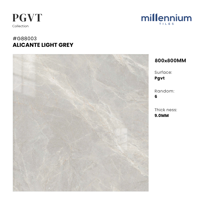 ALICANTE LIGHT GREY – G88003 là dòng gạch PGVT (Polished Glazed Vitrified Tile) cao cấp của Millennium Tiles với kích thước 800x800mm, bề mặt bóng kính sang trọng. Tông xám sáng thanh lịch, kết hợp vân đá nhẹ nhàng và độ phản chiếu tinh tế, mang đến vẻ đẹp hiện đại – sang trọng – tinh giản cho không gian sống và làm việc.