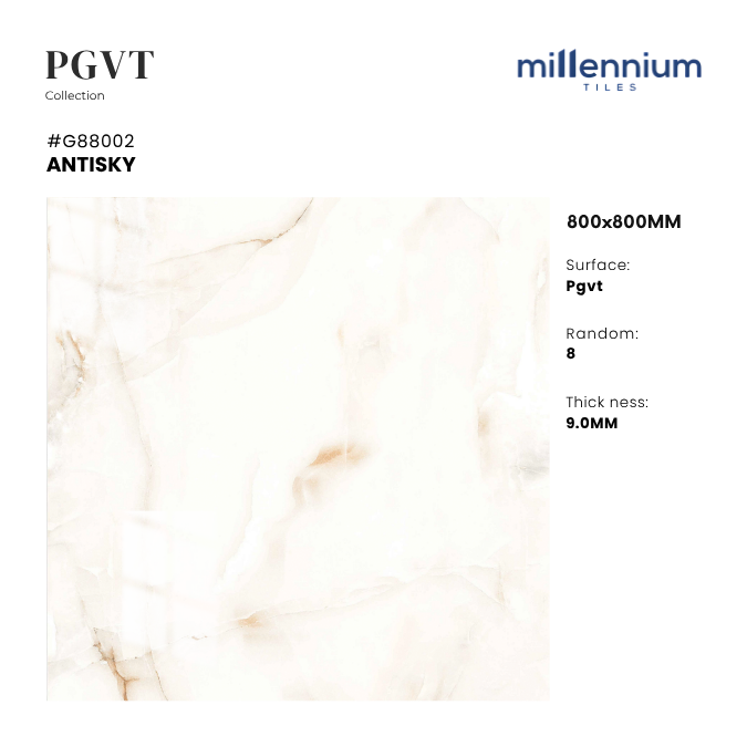 ANTISKY – G88002 là mẫu gạch lát sàn cao cấp thuộc bộ sưu tập PGVT (Polished Glazed Vitrified Tile) của Millennium Tiles. Với kích thước 800x800mm, bề mặt bóng kính sang trọng, gam màu xám tự nhiên cùng vân đá hiện đại, sản phẩm mang lại vẻ đẹp tinh tế – thanh lịch – đẳng cấp cho mọi không gian.