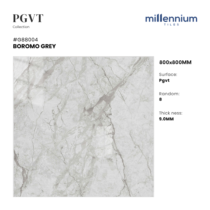 BOROMO GREY – G88004 là dòng gạch PGVT (Polished Glazed Vitrified Tile) cao cấp của Millennium Tiles với kích thước 800x800mm. Bề mặt bóng kính sang trọng, gam màu xám marble đậm cùng đường vân đá mạnh mẽ giúp tôn lên vẻ hiện đại – vững chãi – đẳng cấp cho mọi công trình.