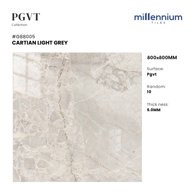 CARTIAN LIGHT GREY – G88005 là mẫu gạch thuộc bộ sưu tập PGVT (Polished Glazed Vitrified Tile) cao cấp của Millennium Tiles. Với kích thước 800x800mm, bề mặt bóng kính sang trọng, tông màu xám nhạt thanh lịch kết hợp vân đá tự nhiên mềm mại, sản phẩm mang đến vẻ đẹp hiện đại – tinh tế – tối giản cho không gian.