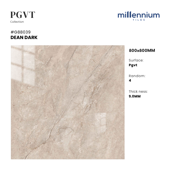 DEAN DARK – G88039 là dòng gạch PGVT (Polished Glazed Vitrified Tile) cao cấp của Millennium Tiles, mang đến giải pháp hoàn thiện sàn nhà sang trọng và bền bỉ. Với kích thước 800x800mm cùng bề mặt bóng kính cao cấp, sản phẩm tái hiện chân thực vẻ đẹp của đá marble xám đậm, vân đá mạnh mẽ và sắc nét, tạo nên sự uy nghi – hiện đại – đẳng cấp cho mọi công trình.