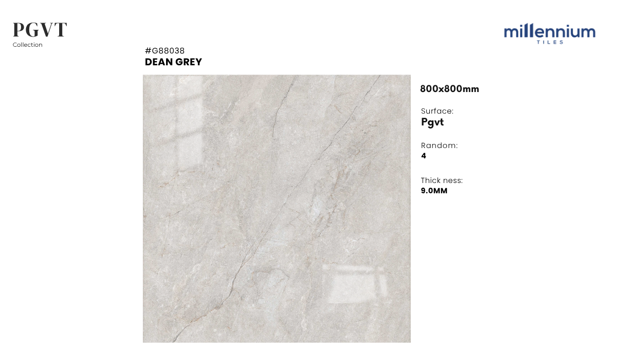 DEAN GREY – G88038 là sản phẩm gạch PGVT (Polished Glazed Vitrified Tile) cao cấp của Millennium Tiles, mang lại sự kết hợp hoàn hảo giữa thẩm mỹ tinh tế và công năng bền bỉ. Với kích thước 800x800mm cùng bề mặt bóng kính sang trọng, gam màu xám trung tính và vân đá marble tự nhiên, sản phẩm đem đến sự hiện đại – thanh lịch – tinh giản cho nhiều loại công trình.