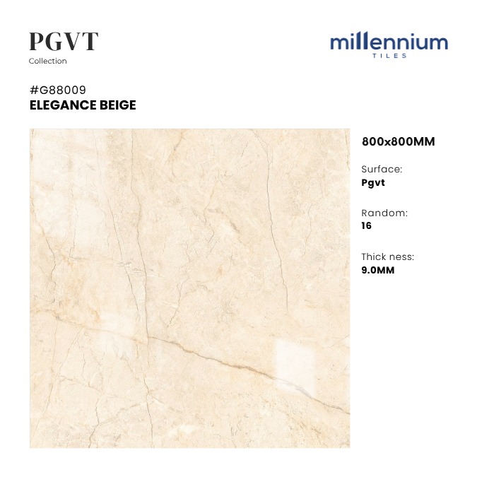 ELEGANCE BEIGE – G88009 là mẫu gạch thuộc bộ sưu tập PGVT (Polished Glazed Vitrified Tile) cao cấp, nổi bật với gam be marble sáng thanh lịch. Với kích thước 800x800mm và bề mặt bóng kính sang trọng, sản phẩm mang đến vẻ đẹp sang trọng – tinh tế – hiện đại, dễ dàng ứng dụng trong nhiều phong cách nội thất.