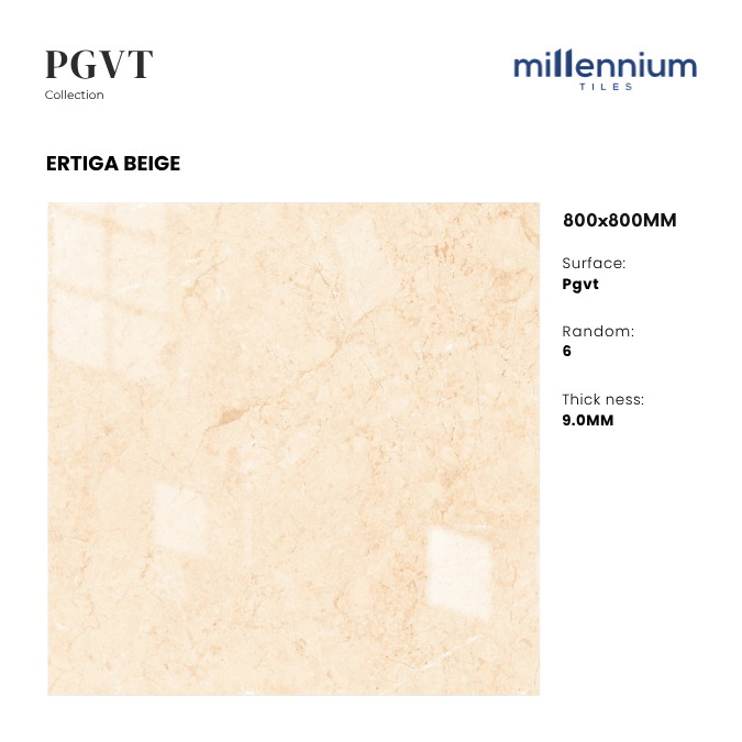 ERTIGA BEIGE là mẫu gạch PGVT (Polished Glazed Vitrified Tile) bóng kính cao cấp, kích thước 800x800mm. Với gam be marble ấm áp và hiệu ứng vân đá tự nhiên sang trọng, bề mặt bóng kính giúp không gian trở nên sáng rộng – thanh lịch – hiện đại, phù hợp cho nhiều phong cách thiết kế nội thất.