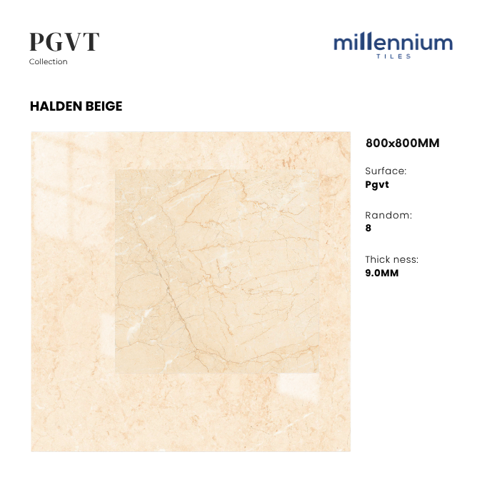 HALDEN BEIGE là mẫu gạch PGVT (Polished Glazed Vitrified Tile) bóng kính cao cấp của Millennium Tiles, kích thước 800x800mm. Với gam be sáng ấm áp cùng hiệu ứng vân đá marble tự nhiên mềm mại, bề mặt bóng kính mang đến sự sang trọng – thanh lịch – đẳng cấp, giúp không gian trở nên rộng mở và sáng thoáng.