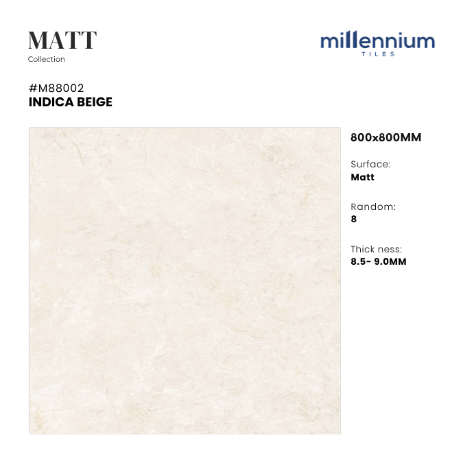 INDICA BEIGE – M88002 là mẫu gạch Matt (mờ, chống trơn) cao cấp với kích thước 800x800mm, mang gam be ấm áp kết hợp vân đá marble tự nhiên thanh lịch. Bề mặt mờ giúp tạo cảm giác tinh tế – nhẹ nhàng – an toàn, lý tưởng cho nhiều loại công trình.