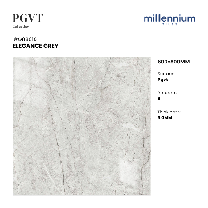 LEGANCE GREY – G88010 là mẫu gạch PGVT bóng kính cao cấp của Millennium Tiles, kích thước 800x800mm. Sản phẩm sở hữu gam xám marble hiện đại kết hợp vân đá tự nhiên tinh tế, tạo nên vẻ đẹp thanh lịch – sang trọng – bền vững cho mọi công trình.