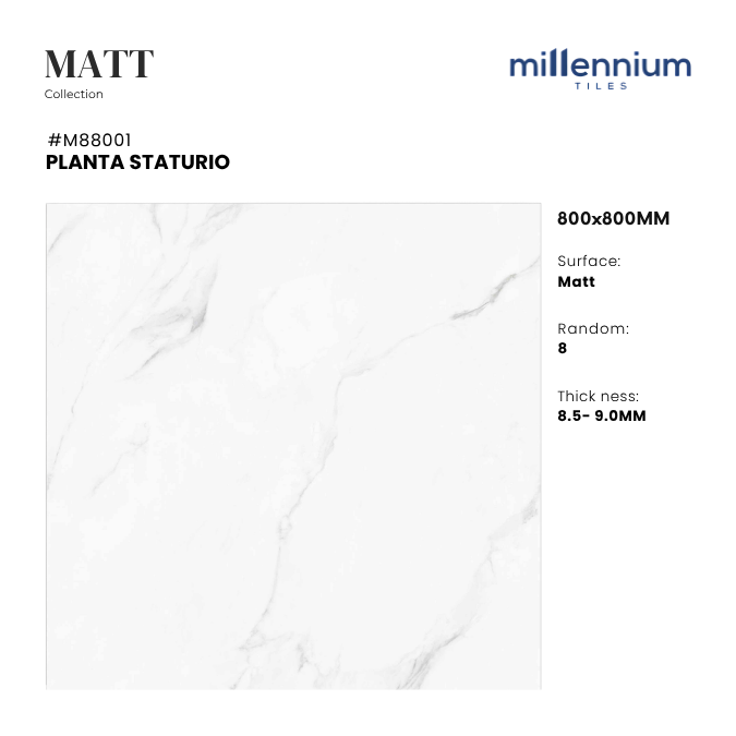 PLANTA STATURIO – M88001 không chỉ là gạch lát sàn, mà còn là giải pháp hoàn thiện không gian theo phong cách hiện đại – tối giản – tinh tế. Với nền trắng marble thanh lịch, vân đá Statuario độc đáo, bề mặt Matt chống trơn và độ bền vượt trội, sản phẩm mang lại sự cân bằng giữa thẩm mỹ – công năng – an toàn, lý tưởng cho cả công trình dân dụng và thương mại cao cấp.