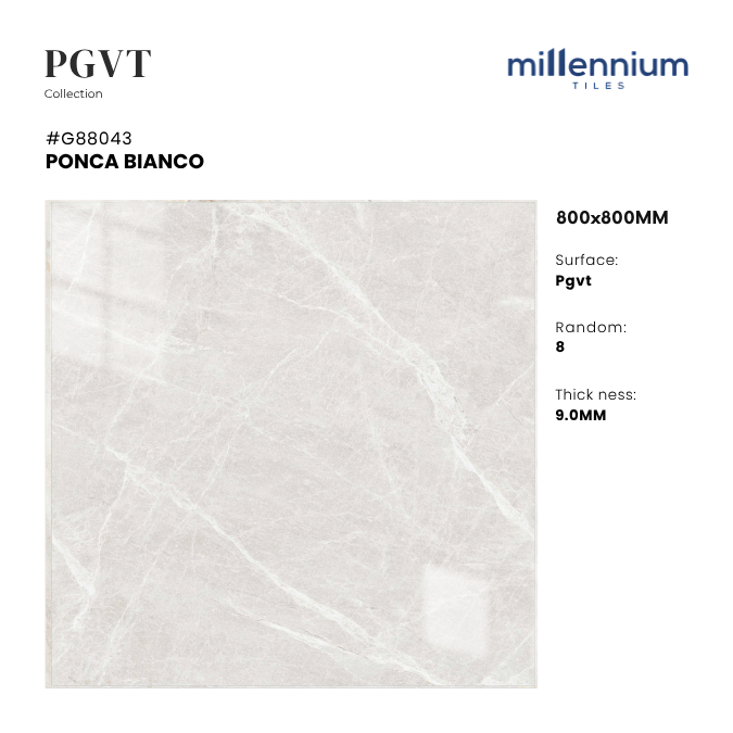 PONCA BIANCO – G88043 là mẫu gạch PGVT bóng kính cao cấp của Millennium Tiles, kích thước 800x800mm, nổi bật với nền trắng sáng tinh khôi kết hợp vân đá marble mềm mại. Sản phẩm mang lại sự sang trọng – thanh lịch – đẳng cấp, dễ dàng ứng dụng trong nhiều loại không gian hiện đại.