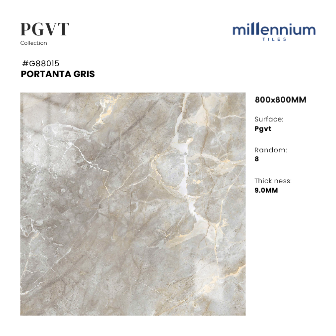 PORTANTA GRIS – G88015 là mẫu gạch PGVT bóng kính cao cấp, kích thước 800x800mm, mang gam xám gris thanh lịch với vân đá marble nhẹ nhàng. Sản phẩm giúp không gian đạt hiệu ứng sáng thoáng hiện đại sang trọng, đồng thời dễ dàng kết hợp với nhiều phong cách nội thất.