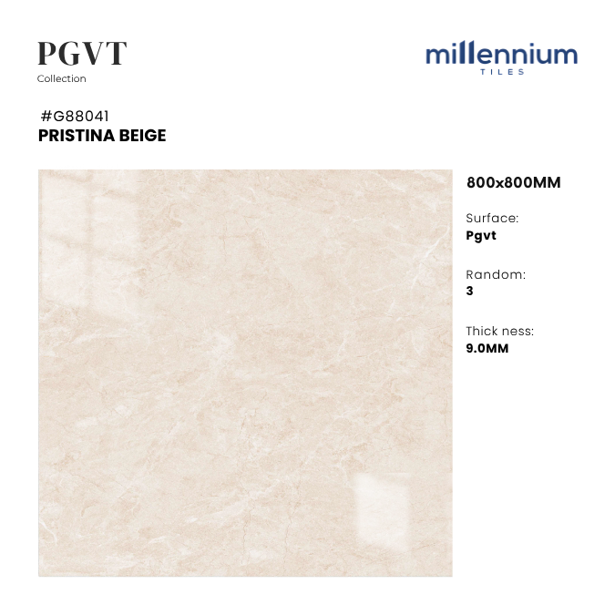 PRISTINA BEIGE – G88041 là mẫu gạch PGVT bóng kính cao cấp, kích thước 800x800mm, nổi bật với gam be marble ấm áp cùng vân đá tự nhiên mềm mại, thanh lịch. Bề mặt bóng kính giúp không gian trở nên sáng thoáng sang trọng hiện đại, phù hợp cho nhiều công trình cao cấp.