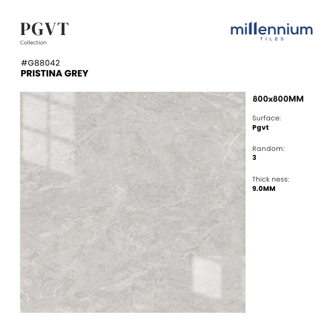 PRISTINA GREY – G88042 là mẫu gạch PGVT bóng kính cao cấp, kích thước 800x800mm, nổi bật với gam xám marble sang trọng cùng vân đá tự nhiên tinh tế. Bề mặt bóng kính mang lại hiệu ứng sáng thoáng – thanh lịch – hiện đại, lý tưởng cho nhiều loại công trình cao cấp.