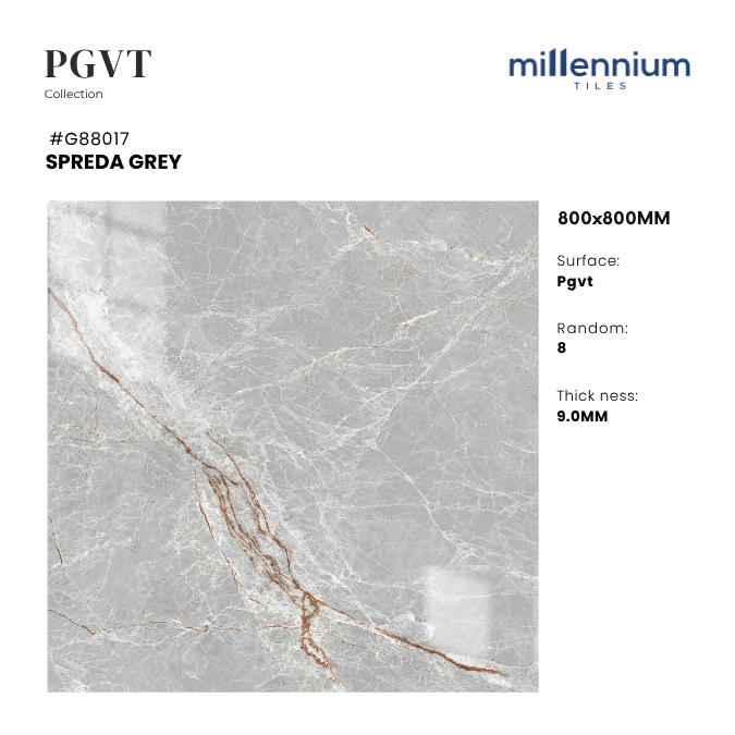 SPREDA GREY – G88017 là mẫu gạch PGVT bóng kính cao cấp, kích thước 800x800mm, nổi bật với gam xám marble hiện đại kết hợp vân đá tự nhiên tinh tế. Bề mặt bóng kính sang trọng giúp không gian đạt hiệu ứng sáng rộng – thanh lịch – đẳng cấp, lý tưởng cho các công trình hiện đại.