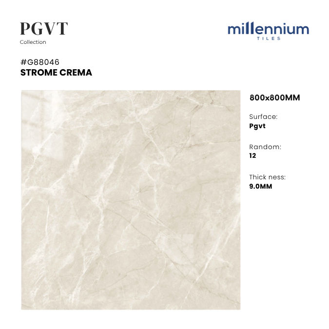 STROME CREMA – G88046 là mẫu gạch PGVT bóng kính cao cấp, kích thước 800x800mm, mang gam crema (be sáng ngà) kết hợp vân đá marble mềm mại. Bề mặt bóng kính tạo hiệu ứng sáng thoáng – sang trọng – thanh lịch, lý tưởng cho không gian hiện đại và cao cấp.