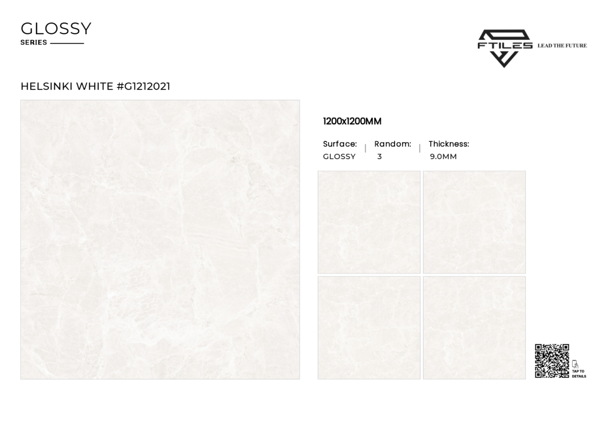 HELSINKI WHITE – G1212021 thuộc bộ sưu tập 1200x1200mm Glossy PGVT cao cấp của FTILES. Đây là mẫu gạch khổ lớn mang gam trắng sáng tinh khiết, lấy cảm hứng từ phong cách Bắc Âu (Scandinavian), kết hợp bề mặt bóng kính sang trọng cùng vân marble nhẹ nhàng, giúp không gian trở nên thoáng rộng – hiện đại – thanh lịch.