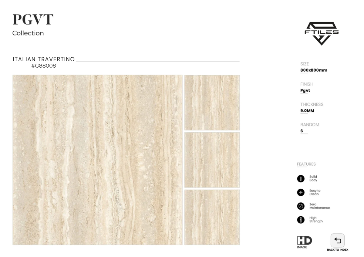 ITALIAN TRAVERTINO – G88008 là mẫu gạch PGVT bóng kính cao cấp lấy cảm hứng từ đá travertine Ý tự nhiên, mang lại nét đẹp cổ điển – sang trọng – tinh tế. Với kích thước 800x800mm, bề mặt bóng kính kết hợp gam màu be sáng tự nhiên, sản phẩm dễ dàng tạo điểm nhấn cho không gian sống và công trình cao cấp.